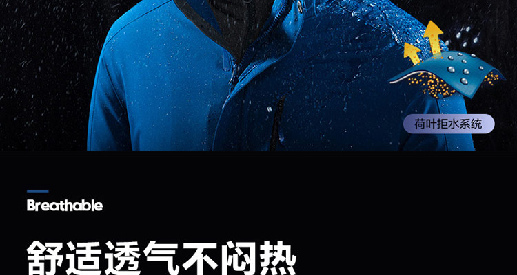 防潑水科技面料,類似荷葉效果,有效的阻擋小雨對人體運動的干擾,保持干爽舒適