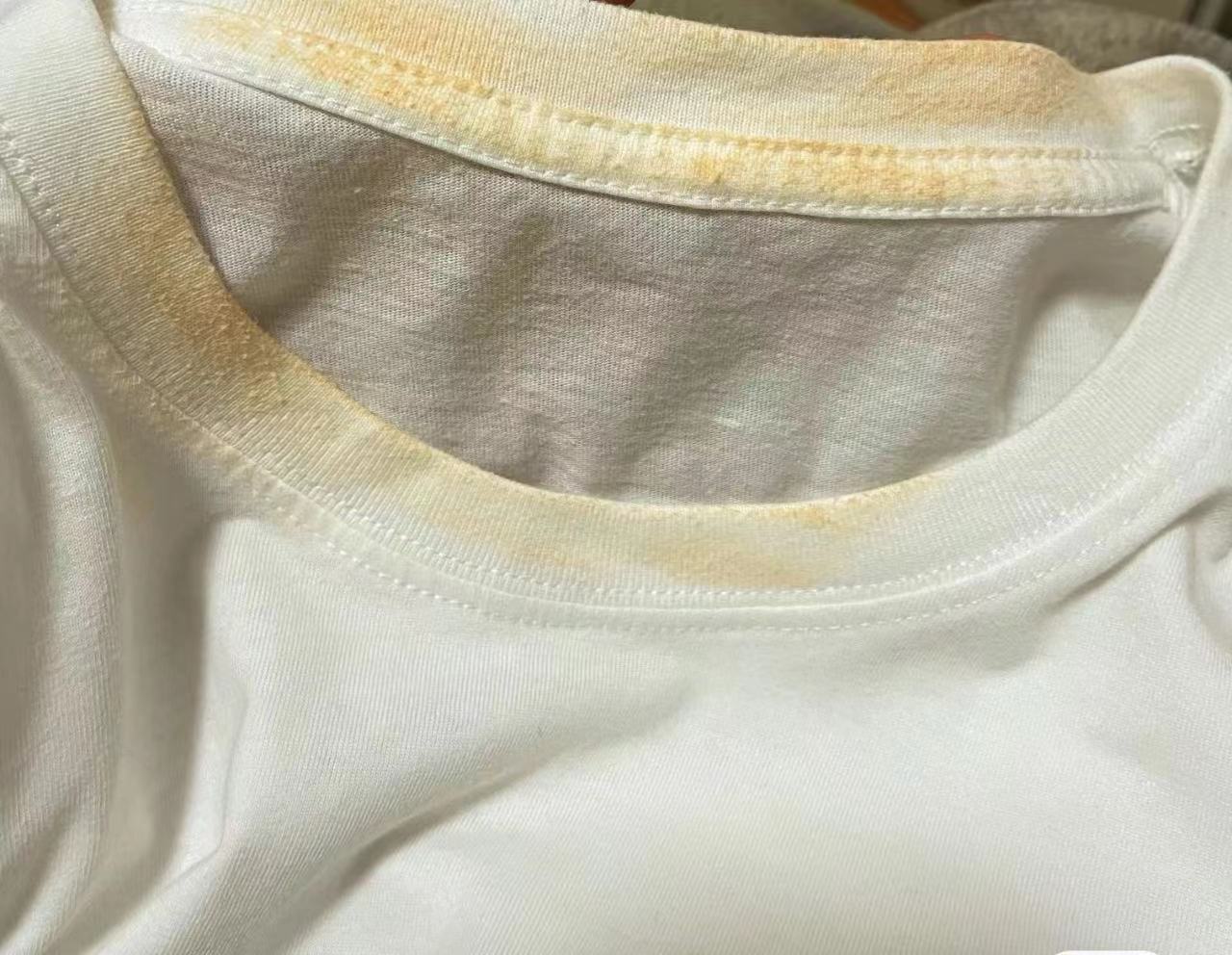 2. 汗?jié)n:人體分泌的汗液中含有酸性物質(zhì),與染料發(fā)生反應(yīng)后容易導(dǎo)致T恤發(fā)黃。